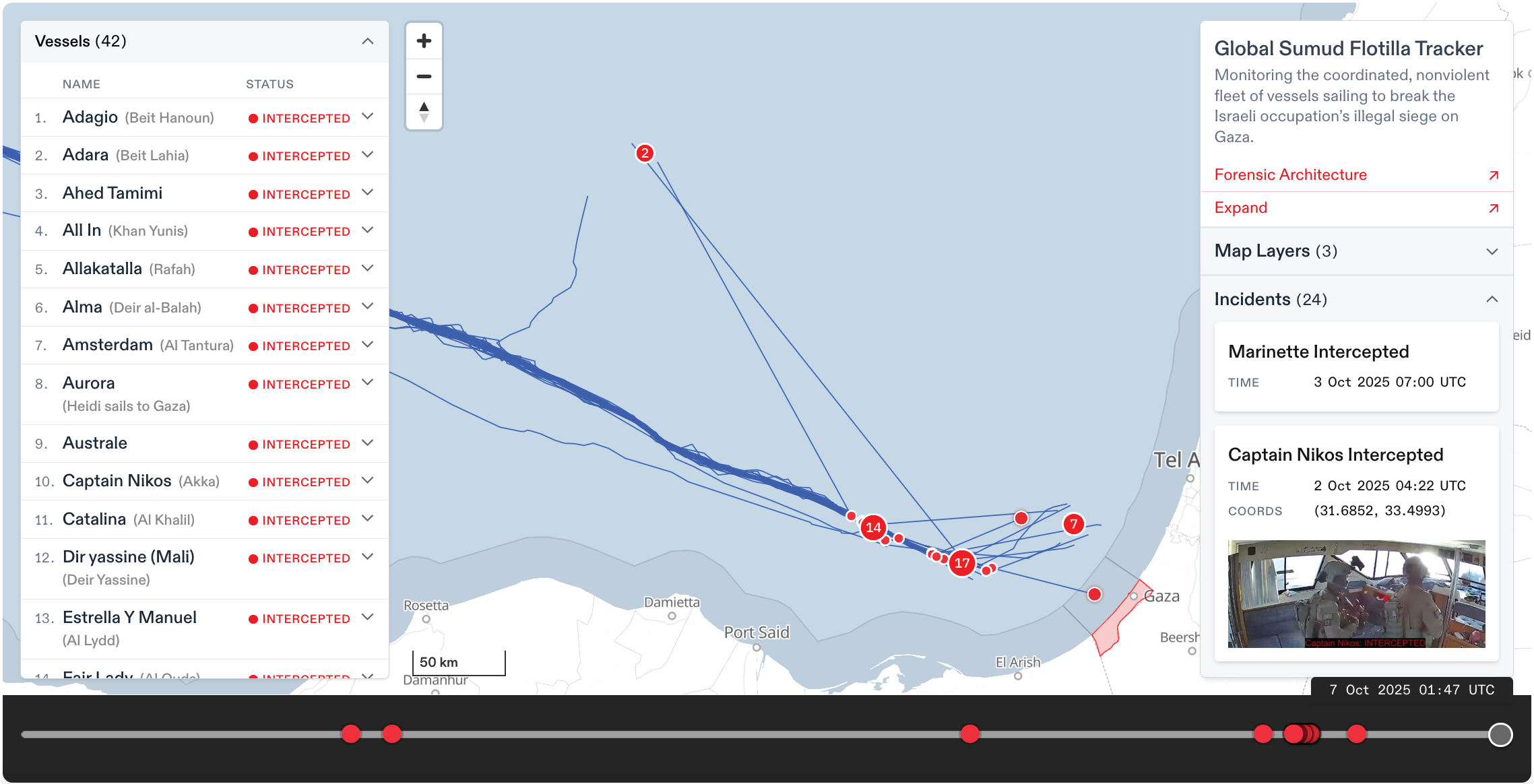 Throughout the Global Sumud Flotilla mission (see my just-prior post Brand ID for Freedom), we were able to see the location of participant vessels in real-time (or close enough) plotted via GPS on a map of the Mediterranean region.